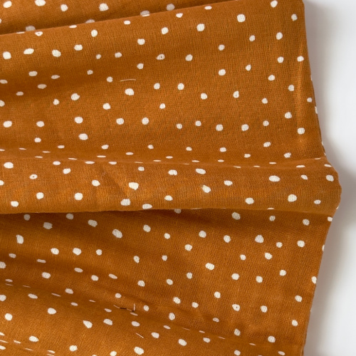Part of the “Canyon Blooms” collection, designed by Alison Janssen for Cloud9 Fabrics, is inspired by the daily trail hikes Alison takes near her home in Southern California. No matter the season, there is always an abundance of native flowers painting the landscape with new color palettes and endless inspiration. This delicate 100% organic cotton double gauze has a lovely soft feel and a moderate drape. “Ditsy Raindrops” is semi-sheer with an dark mustard gold background, and sporadic ivory abstract-shaped spots throughout.