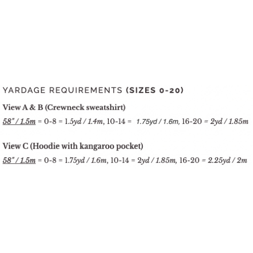 | What else do I need? | Recommended fabric: Choose thicker knit fabrics like cotton fleece, polar fleece, French terry, ponte, and double knits with at least 15% crosswise stretch. Optional: contrast fabric for View B gathered band (may substitute with main fabric). *See gallery image for fabric amount requirements based on size choice. Supplies: |