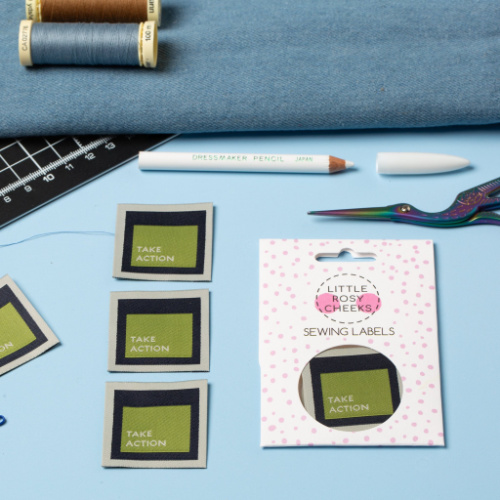 “TAKE ACTION” is a large end-folded label, and part of the “Men Sew Too” collection from Little Rosy Cheeks. The message is woven in stone thread in a khaki green rectangle, set in a navy rectangle, on a stone background.
