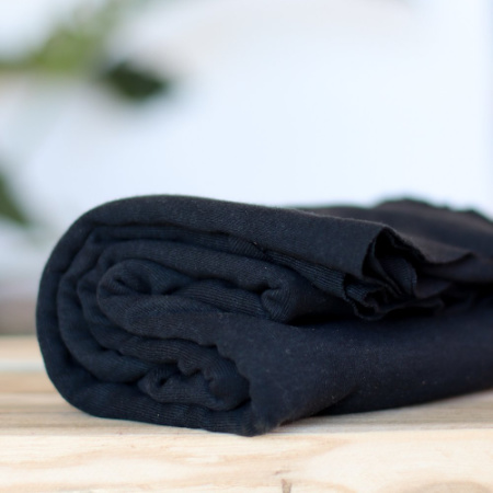 This light-weight TENCEL brand lyocell blend fine ribbing jersey knit from Danish high-end fabric manufacturer meetMILK has a lovely drape, a buttery soft touch, good recovery, and matches the colors of the meetMILK French terry knit well. This TENCEL fine ribbing jersey knit in “black” is a rich midnight color, and created using OEKO-TEX certified dyes.