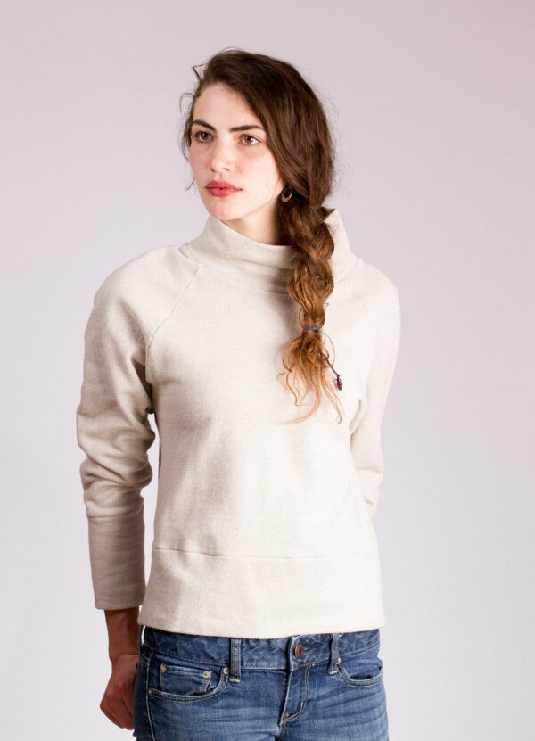 Sweater #1: Is a closer fitting, semi-cropped sweatshirt/sweater. It works best when sewn in thick, stiff knits with some body to keep the neck standing upright. It features raglan sleeves, a wide waistband, a loose turtleneck, long cuffs and falls between the high and low hip. It’s great in a standard sweatshirt fleece (with stretch) however, it’s also extremely handsome in a sweater knit to dress it up a bit.