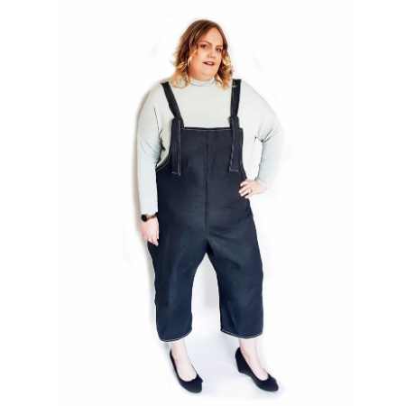 This pattern is made with simple techniques and is beginner friendly. You can expect generous ease on the hips and thighs, and crotch depth is noted in the instructions with clear lines on pattern so you know where to make alterations if the fit needs tweaking for you. However, as these overalls are designed to be pulled on, with no hip or waist fastenings to secure them, you will want to cut the hip size closest (but not smaller) than your hip measurement for ease getting them on.